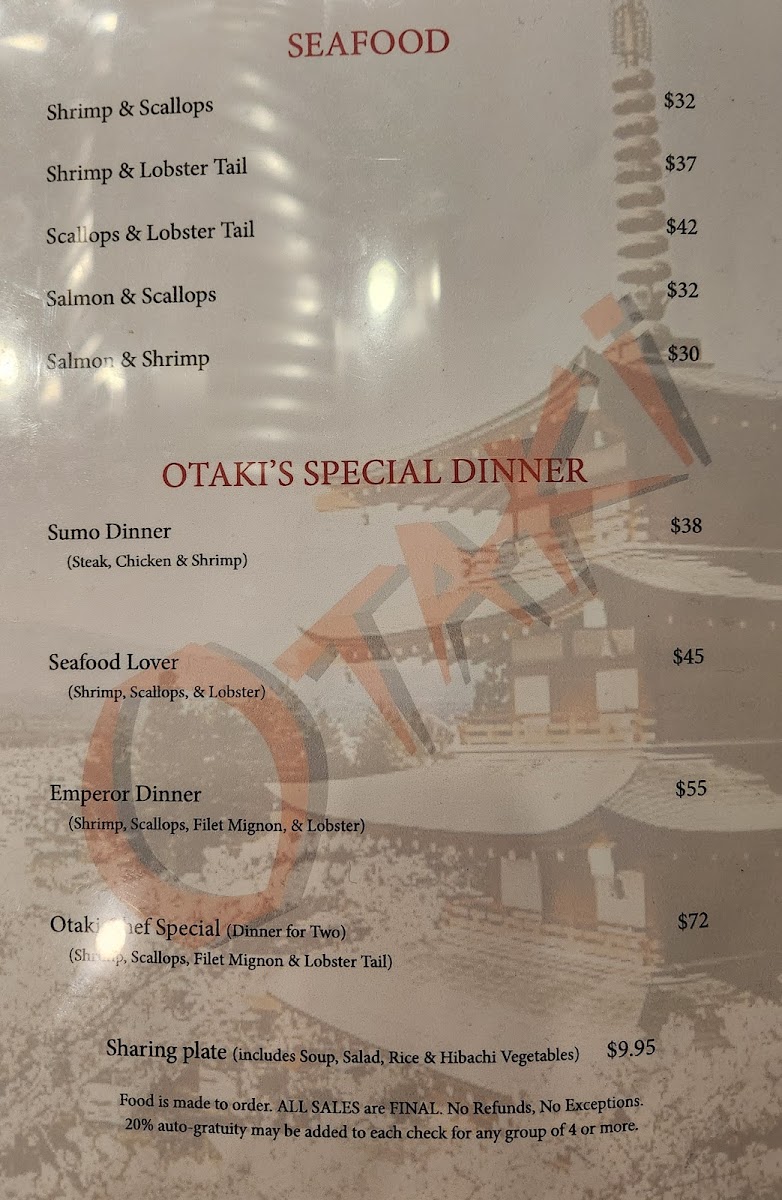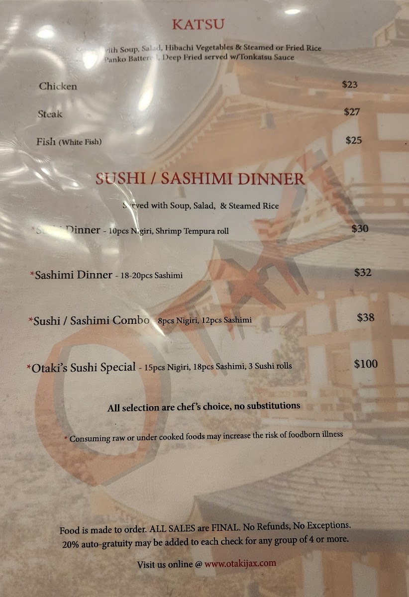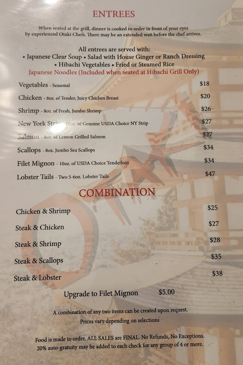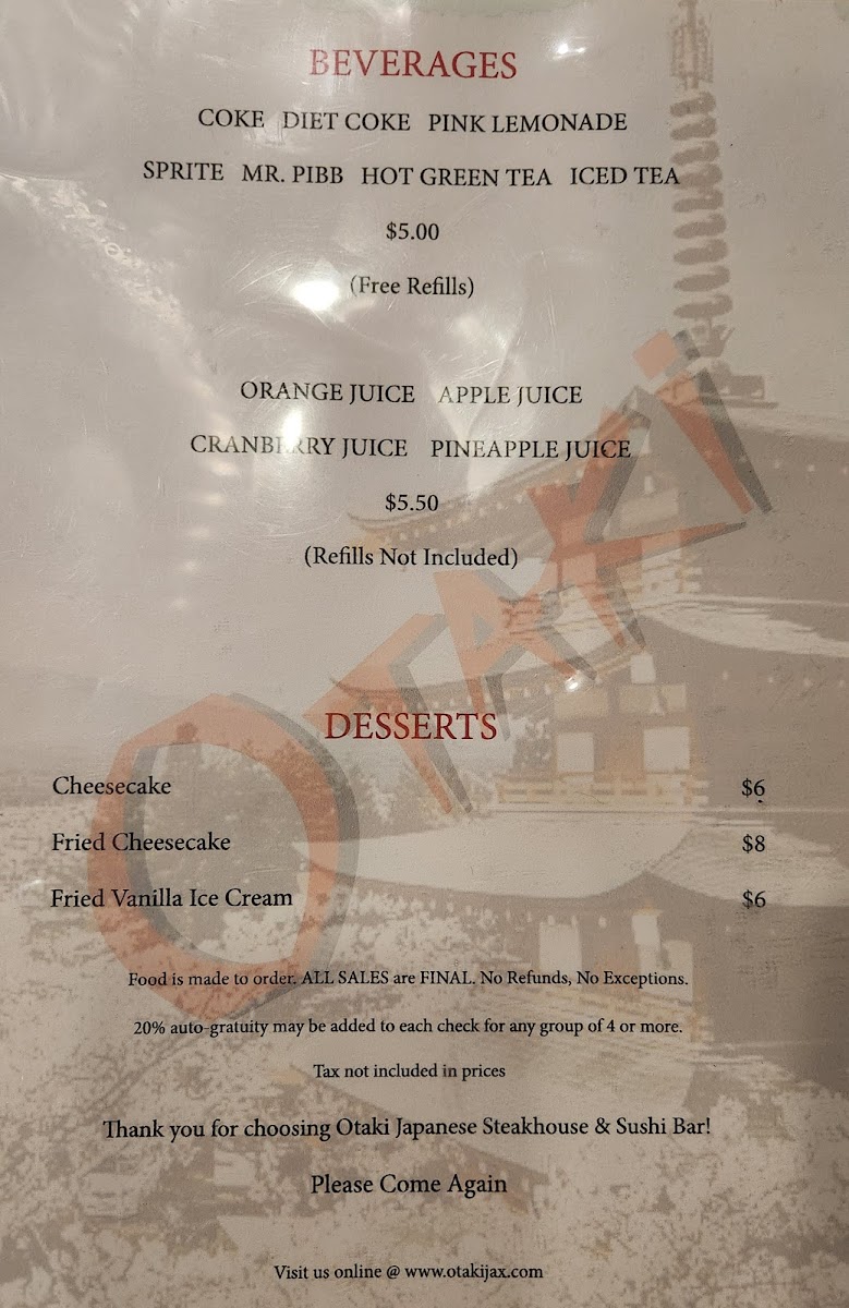 The menu at Otaki Japanese Steakhouse in Jacksonville offers a balanced mix of classic Japanese steakhouse fare and refreshing sushi options, perfect for both casual lunches and relaxed dinners. Guests can enjoy a friendly, welcoming atmosphere where the focus is on fresh ingredients and traditional preparation, paired with attentive service.
