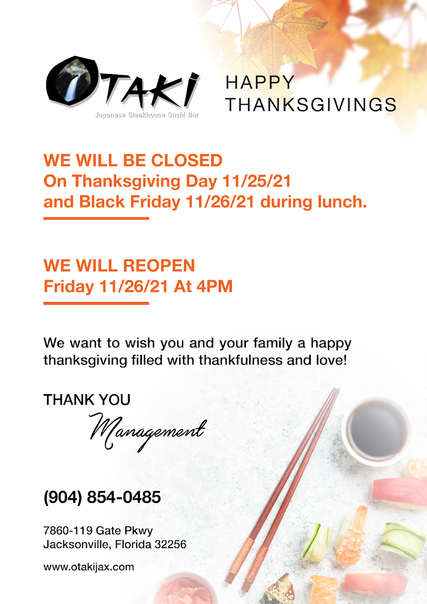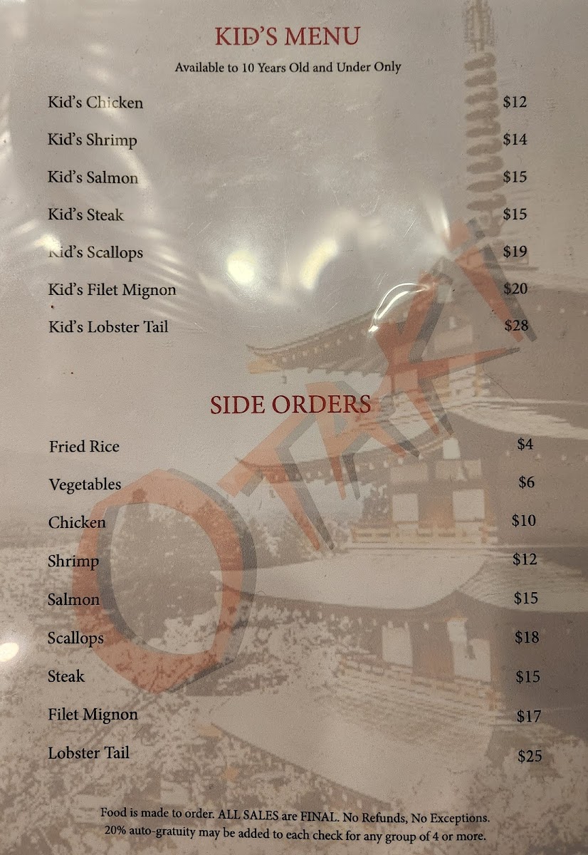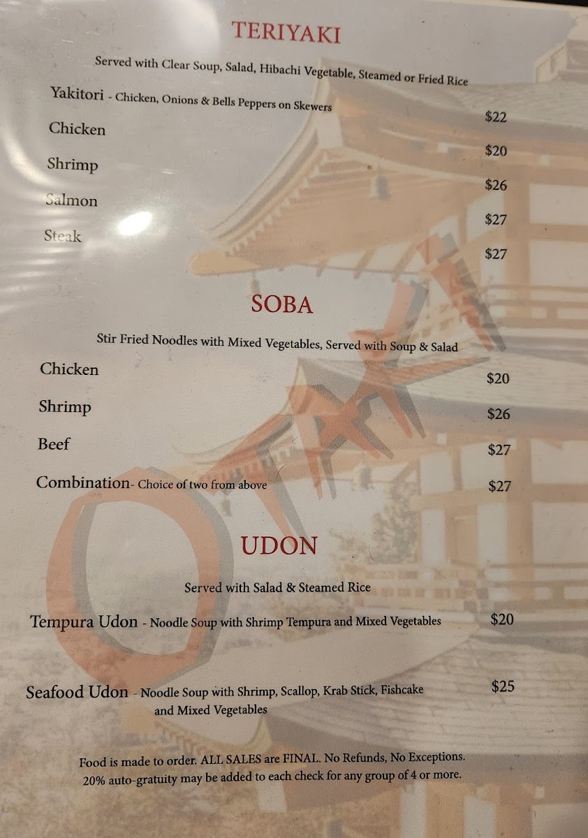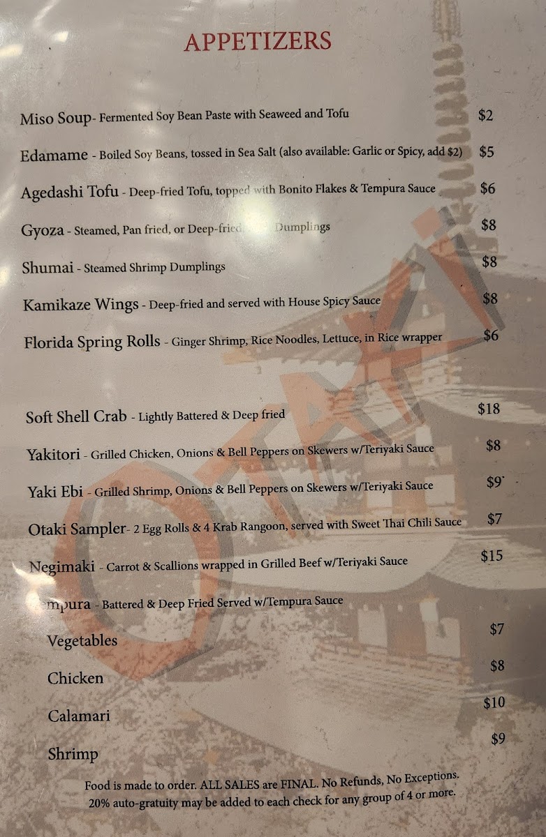 The menu at Otaki Japanese Steakhouse in Jacksonville offers a balanced mix of classic Japanese steakhouse fare and refreshing sushi options, perfect for both casual lunches and relaxed dinners. Guests can enjoy a friendly, welcoming atmosphere where the focus is on fresh ingredients and traditional preparation, paired with attentive service.